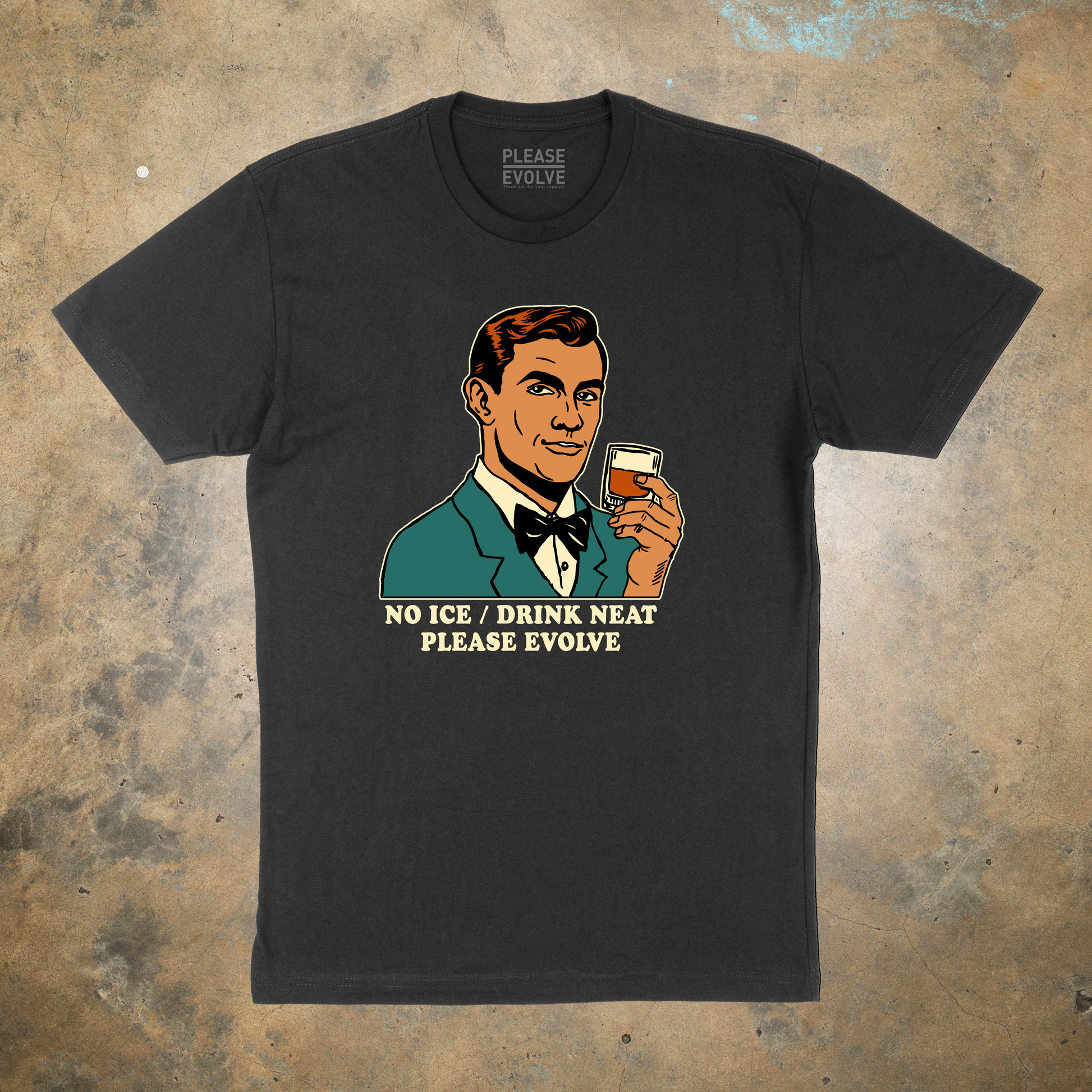 At first glance, the design feels retro and refined—a mid-century style illustration of a man holding a drink, calm and composed. Look closer, and the message becomes unmistakable. NO ICE / DRINK NEAT isn’t just about what’s in the glass. It’s a pointed rejection of cruelty, enforcement culture, and systems that profit from dehumanization. This is a political t-shirt that lets intelligence do the shouting.